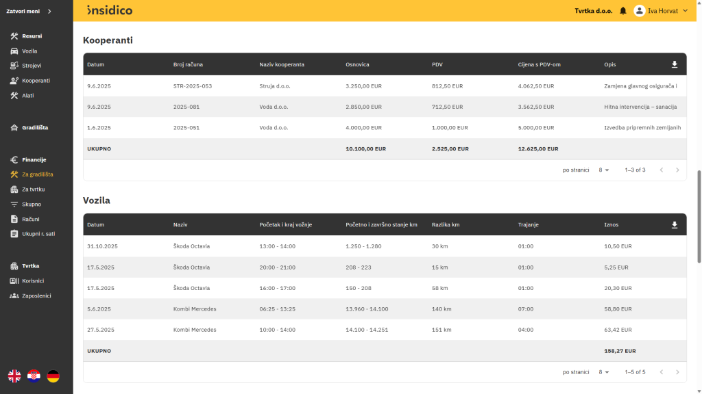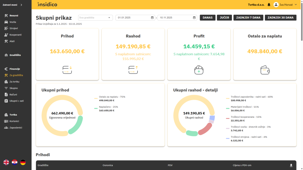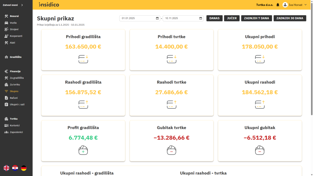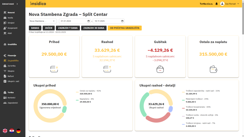 Manje je ručnog prepisivanja i naknadnih ispravaka, a više vremena ostaje za analizu, usporedbu gradilišta i planiranje. Primjerice, umjesto da danima provjeravate troškove po projektima, u Insidicu možete jednim klikom vidjeti koja gradilišta odstupaju od plana.