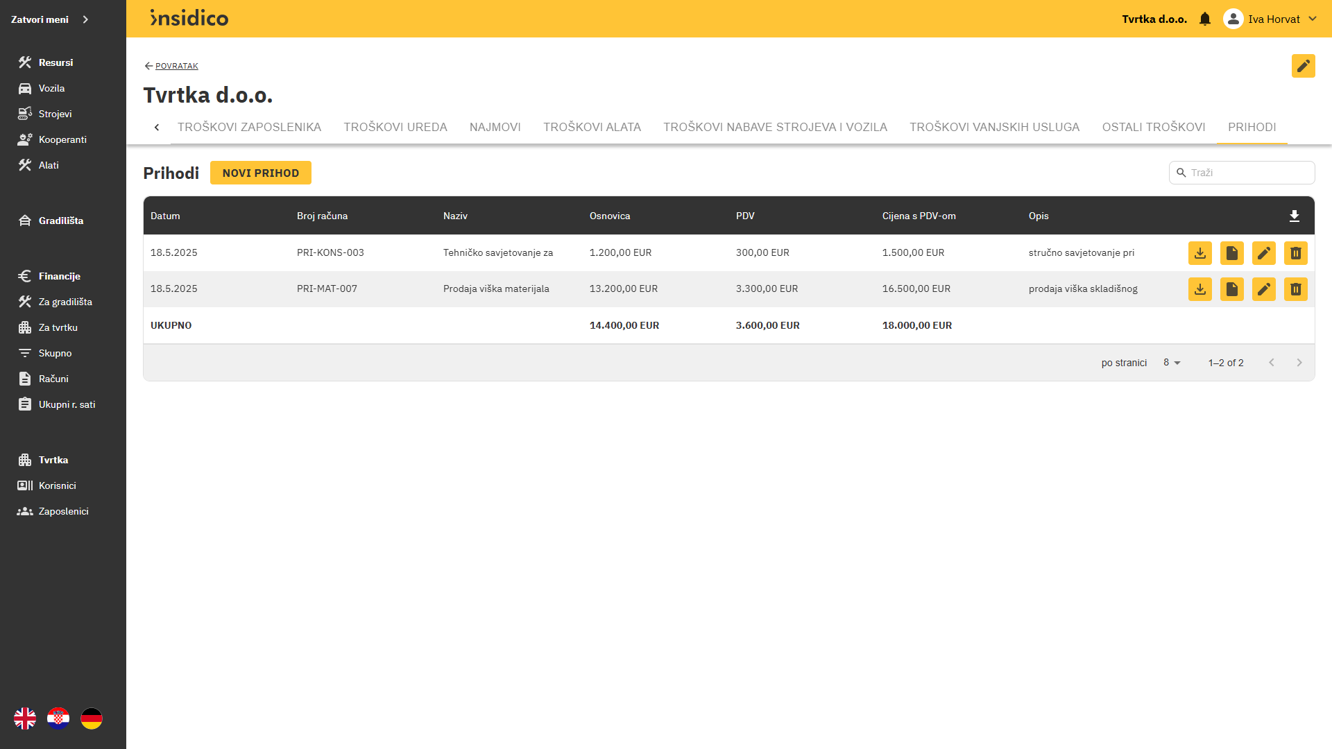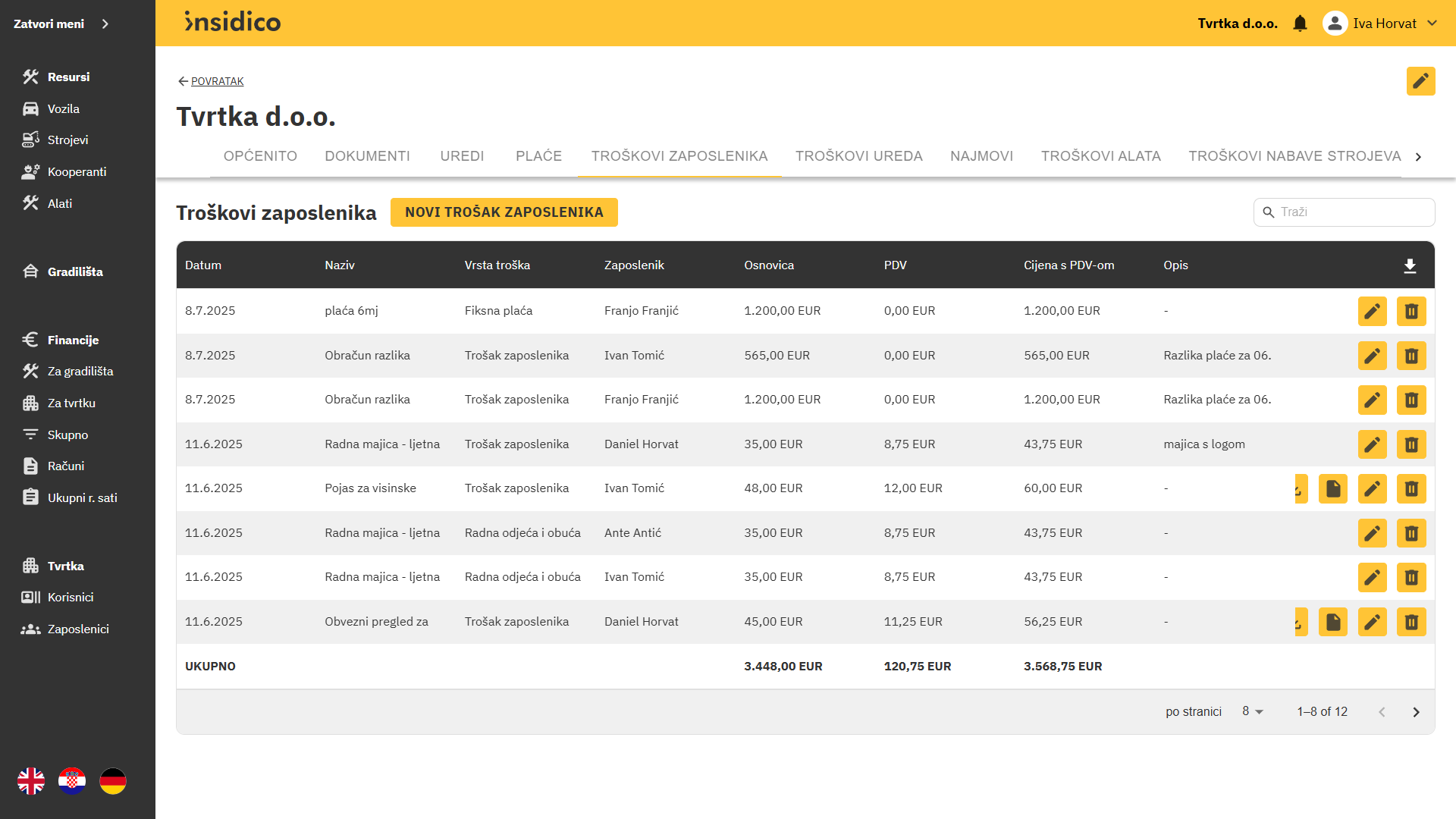 Moguće je voditi detaljnu evidenciju plaća i svih dodatnih troškova vezanih uz zaposlenike, poput zaštitne opreme, edukacija, liječničkih pregleda, obroka i prijevoza. Sustav prikazuje preporučenu plaću, izračunatu prema bruto satnici i broju evidentiranih sati, a korisnik po potrebi može unijeti i stvarno isplaćenu plaću ako postoji razlika. Na ovaj način tvrtka dobiva potpun uvid u interne troškove radne snage i jasnu kontrolu nad financijama.