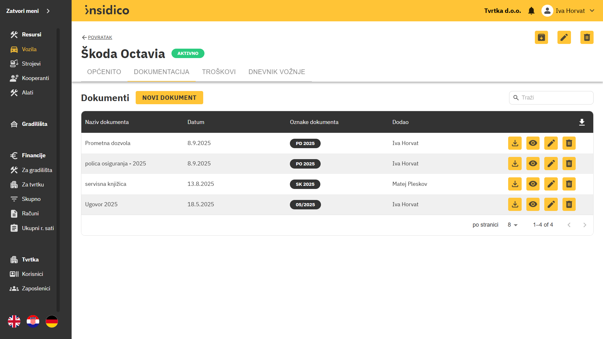 Potpuna kontrola voznog parka i građevinske opreme. Modul Vozila i strojevi u Insidico aplikaciji omogućuje detaljno praćenje i digitalno upravljanje svim vozilima i strojevima u građevinskoj tvrtki. Na jednom mjestu dostupni su podaci o korištenju, troškovima, radnim satima i dokumentaciji. Centralizirani sustav smanjuje administraciju, povećava transparentnost i pomaže u donošenju informiranih odluka o voznom parku i strojnim resursima.