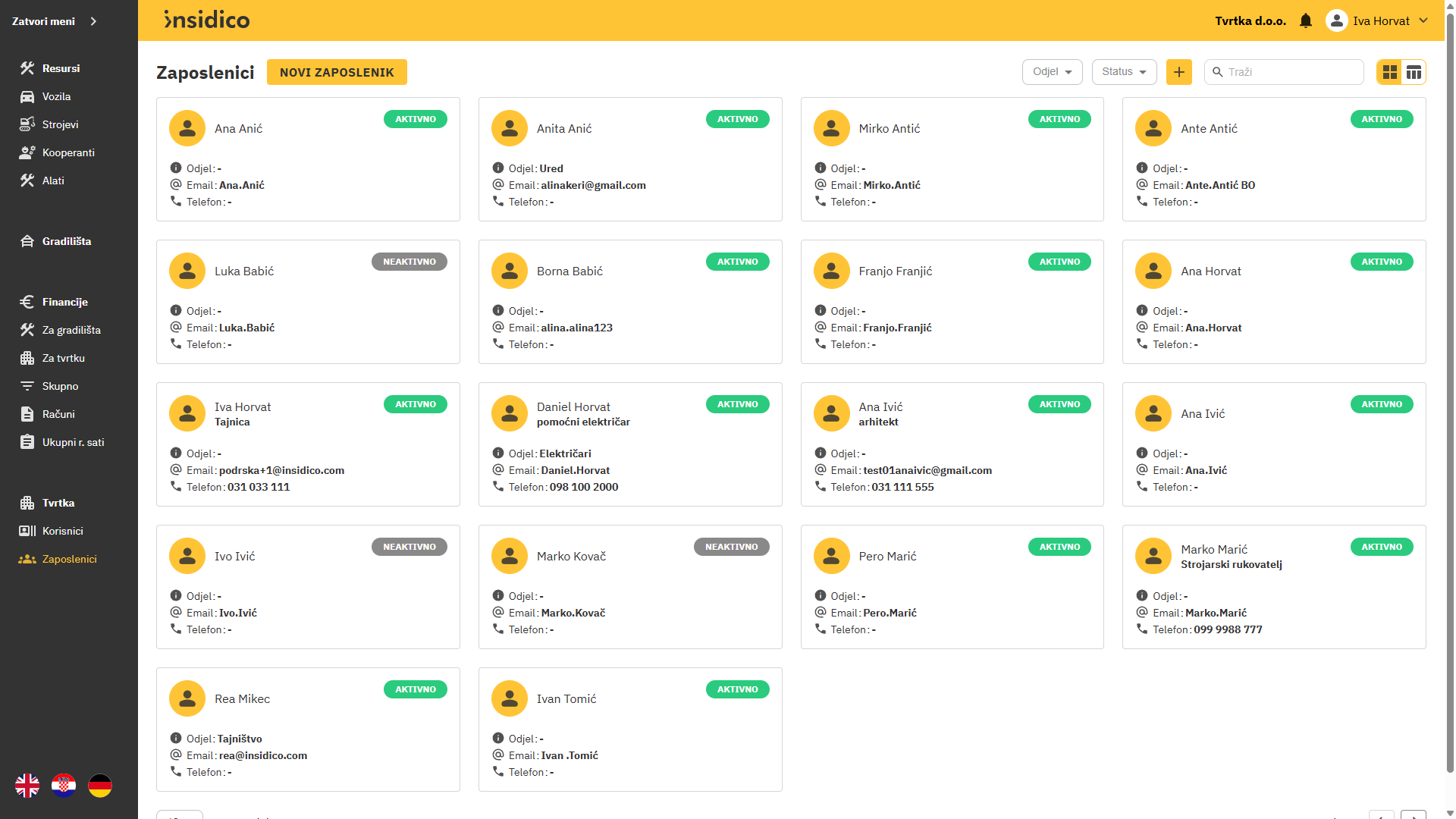 Zaposlenici su svi članovi tvrtke evidentirani u Insidico aplikaciji. Za svakog zaposlenika vodi se detaljna evidencija osobnih podataka, ugovora, radnog statusa, radnih sati, troškova i odsutnosti. Oni ne moraju imati pristup aplikaciji, a Insidico se koristi za praćenje njihovog angažmana, planiranje ljudskih resursa i kontrolu troškova rada.