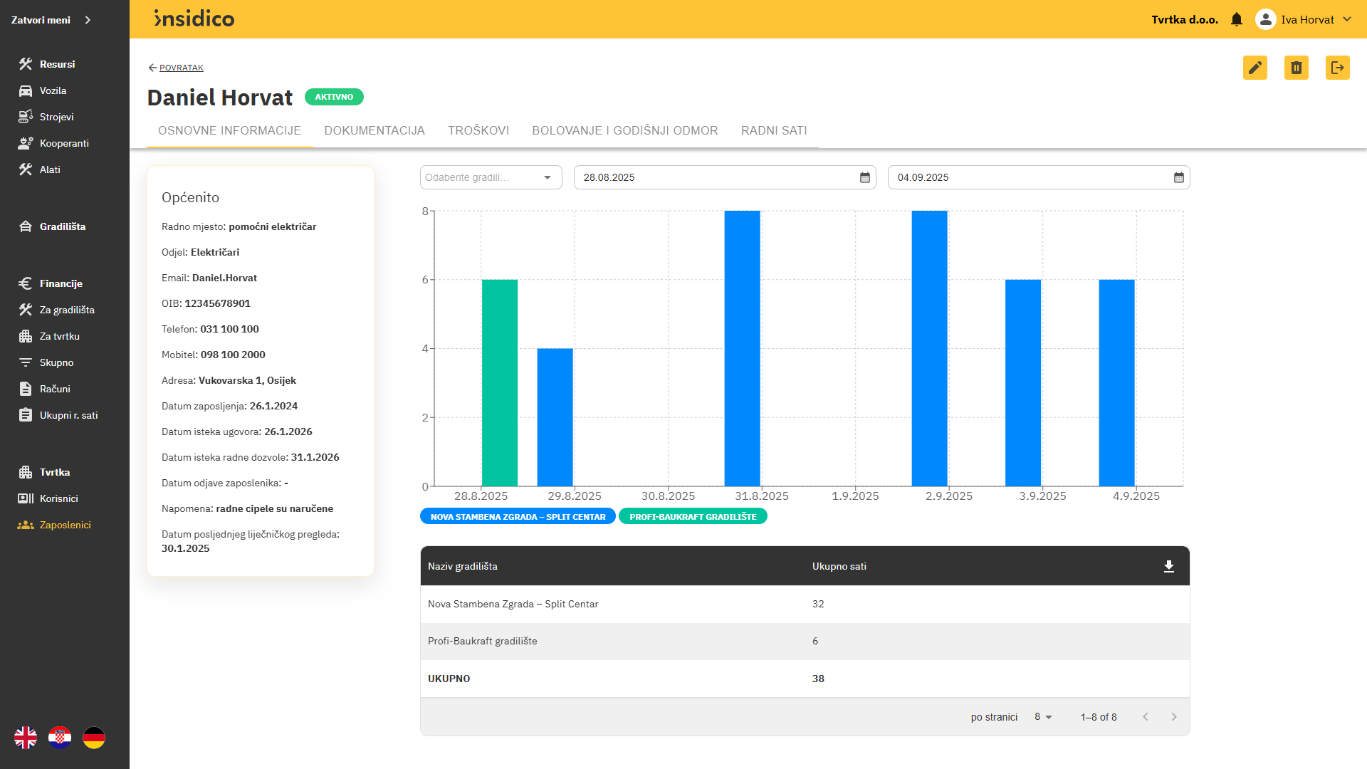 Modul Zaposlenici i korisnici u Insidico aplikaciji omogućuje digitalno i centralizirano vođenje svih podataka o zaposlenicima građevinskih tvrtki. Na jednom mjestu dostupne su informacije o radnim satima, troškovima rada, odsutnostima i dokumentaciji. Time se osigurava transparentnost i precizno planiranje ljudskih resursa u građevini.