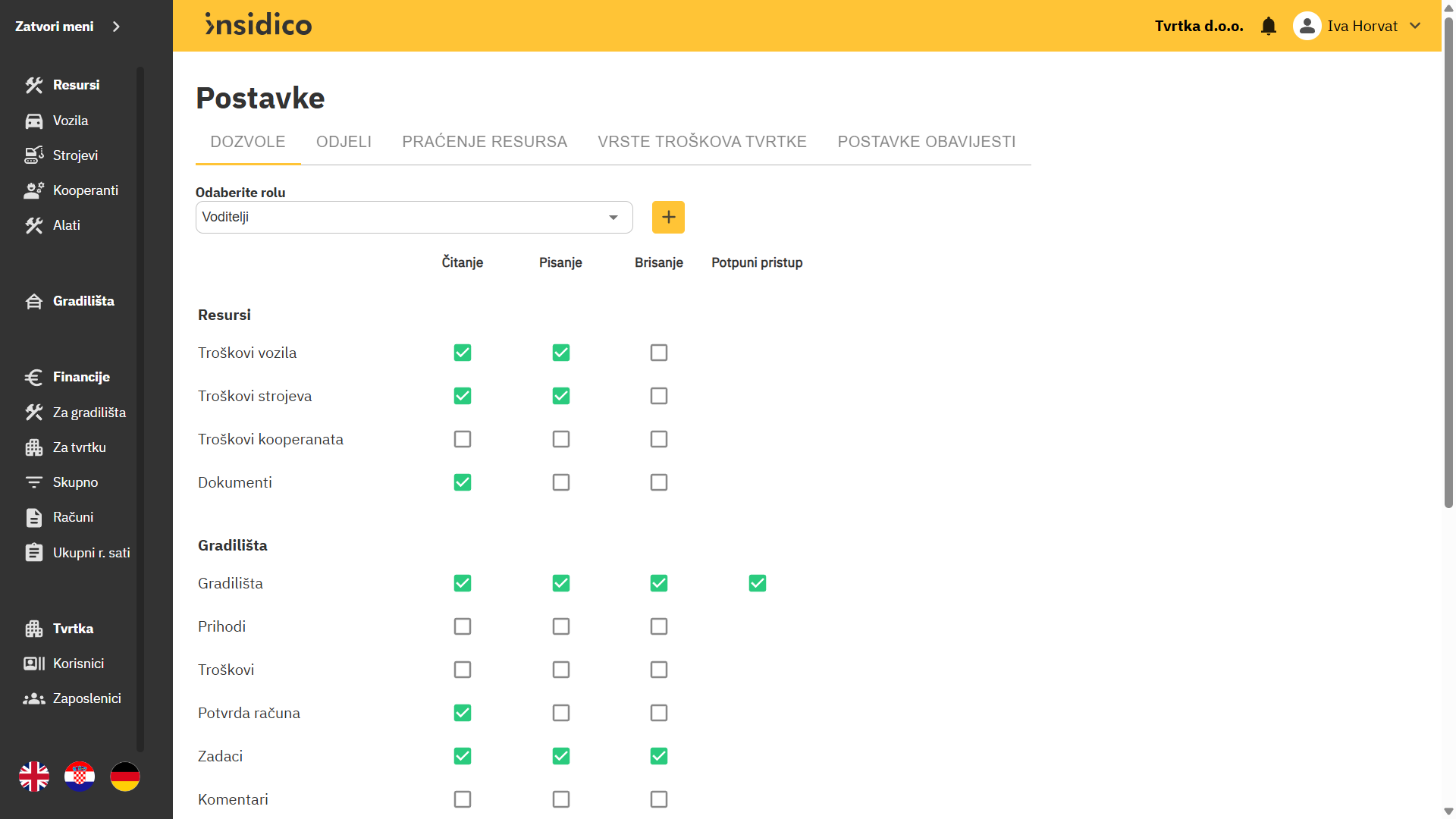 Korisnici su djelatnici kojima je omogućen pristup Insidico aplikaciji. Svakom korisniku administratori kreiraju, a zatim dodjeljuju uloge i ovlasti u skladu s njegovom funkcijom i odgovornostima. Primjerice, administrativno osoblje i menadžment mogu imati uvid u financijske izvještaje i nadzorne ploče, dok operativno osoblje na gradilištima može unositi sate, ali nema pristup financijskim podacima. Ovakav sustav prava osigurava da svatko vidi i koristi samo ono što je povezano s njegovim radnim zadacima.
